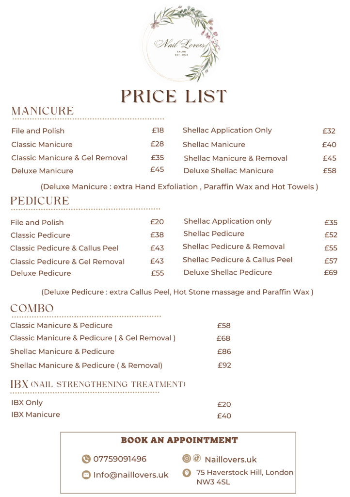 Discover our nail services and price list at Nail Lovers, a trusted nail salon on Haverstock Hill, Belsize Park London. We offer manicure, pedicure, BIAB and shellac nail treatments, all delivered with exceptional care and attention to detail.